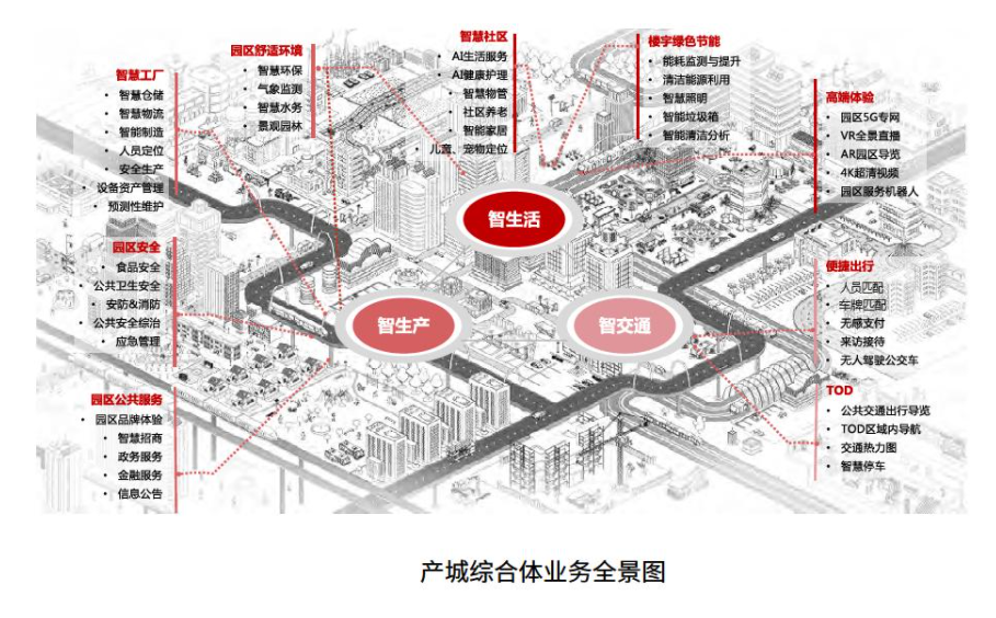 基于藍(lán)圖框架,圍繞產(chǎn)城綜合體中社區(qū)、工廠、樓宇、交通、環(huán)境、安全和公共服務(wù)等場(chǎng)景,可以全面勾勒出未來(lái)產(chǎn)城綜合體的全景圖(如圖所示)。