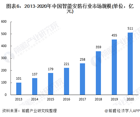 根據中安網《2020年中國安防行業調查報告》,2020年我國安防行業總產值為8510億元(其中安防產品總產值約為2600億元),根據2020年我國智能安防滲透率為6%測算,2020年我國智能安防市場規模約為511億元,2013-2020年市場規模年復合增長率達26%。